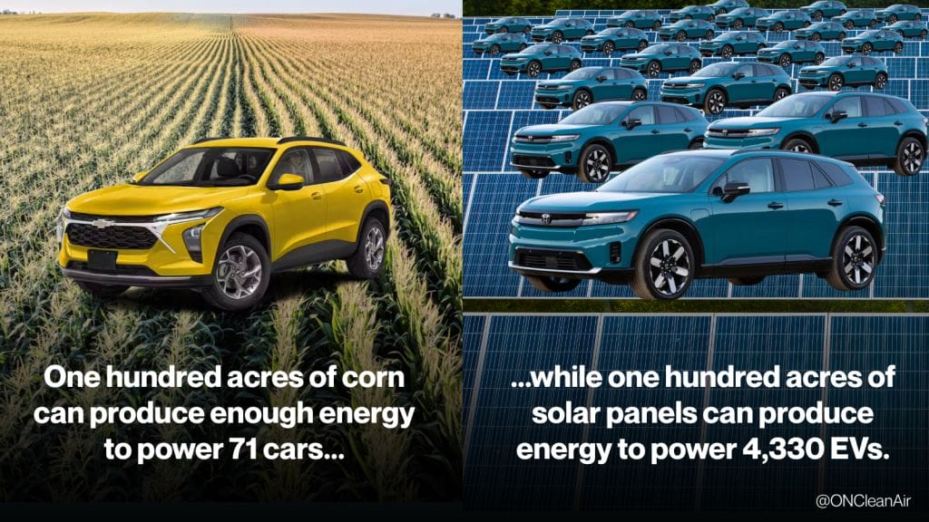 With the switch to EVs accelerating, blending ethanol with gasoline is rapidly becoming an outdated climate solution. Solar combined with EVs can produce so much more useful energy that it would take less than 2% of the acres currently used to grow corn for vehicles, for solar to power the same number of vehicles.