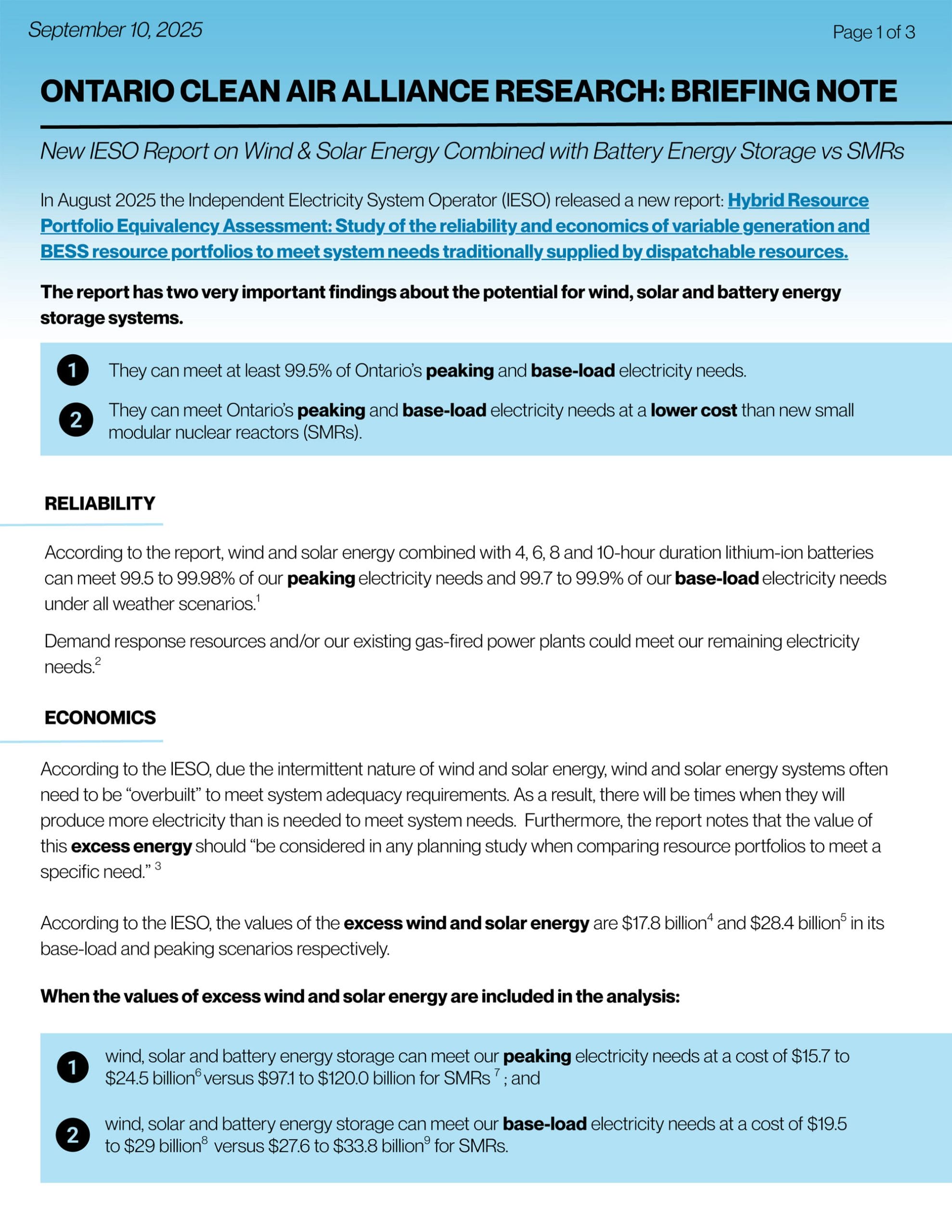 Briefing note: New IESO Report on Wind & Solar Energy Combined with Battery Energy Storage vs SMRs