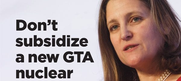 Our new pamphlet calls on federal Finance Minister Chrystia Freeland to do the smart thing and not waste any further tax dollars on the steadily declining nuclear industry. The federal government must focus on renewable energy as a real and ready climate solution, not empty promises from a nuclear industry that never delivers.